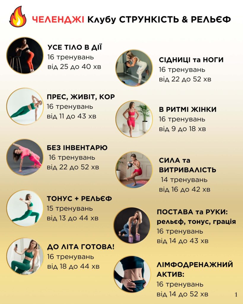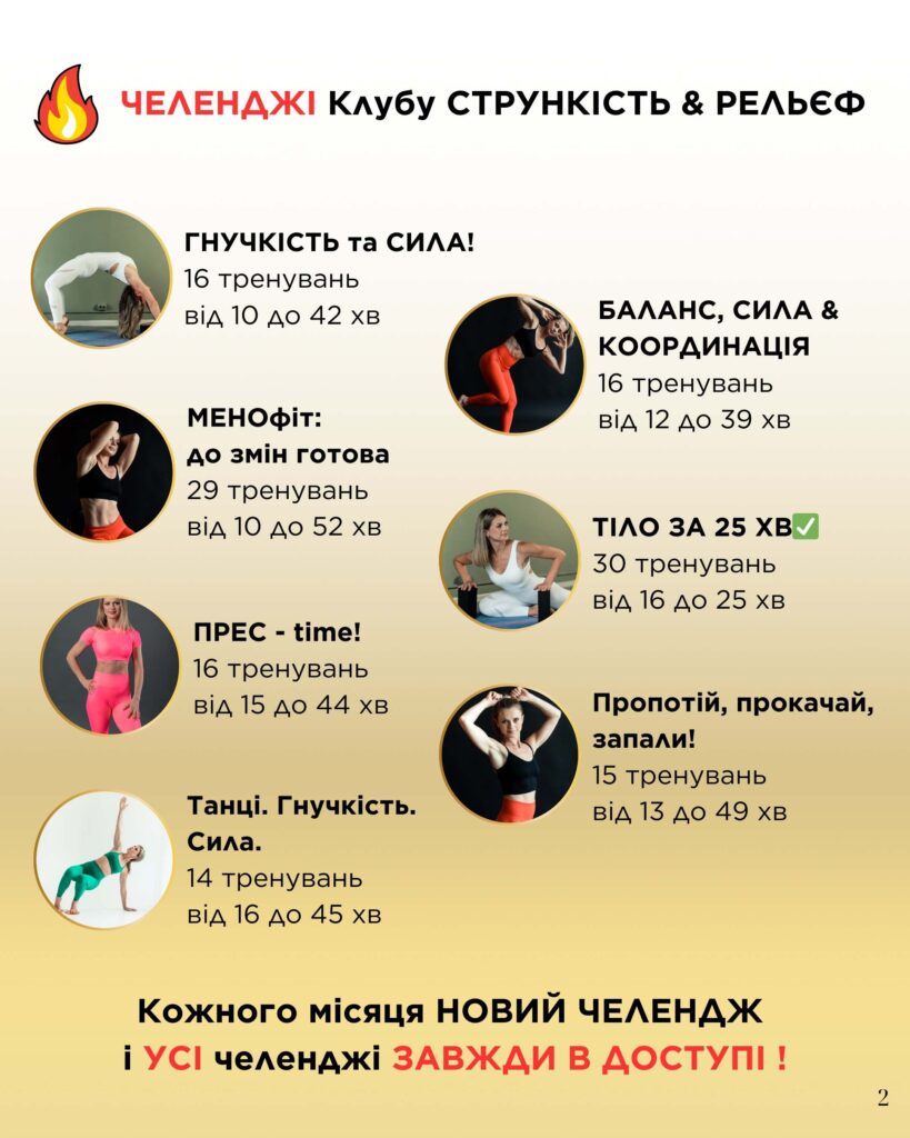 Щомісячні тематичні челенджі “Прес”, “Сідниці”, “Все тіло” тощо завжди в доступі.